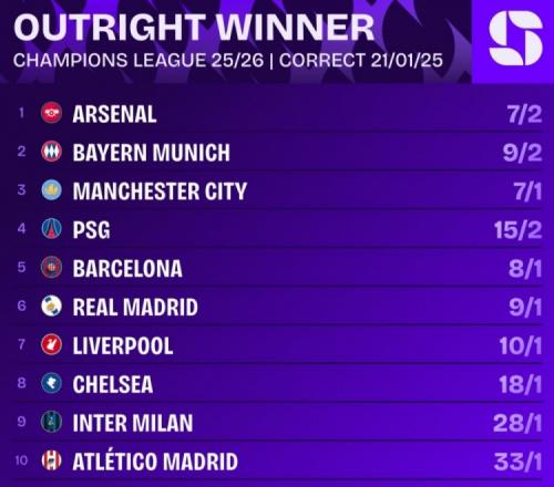 欧冠最新夺冠赔率:阿森纳居首,拜仁、曼城、巴黎、巴萨前五
