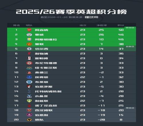 北京时间1月26日,2025/26赛季英超联赛结束了第23轮的绝大部分比赛,积分榜的形势也产生了进一步的变化。