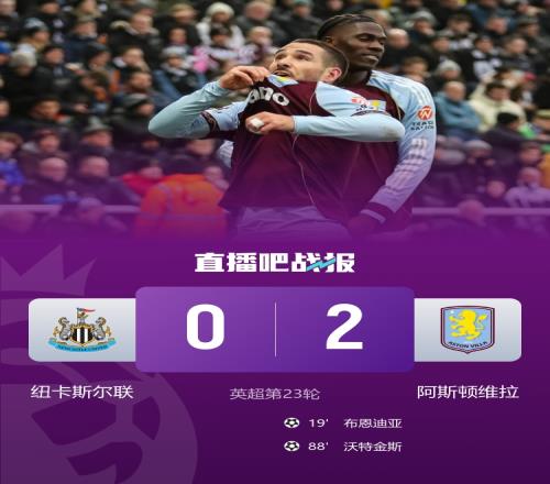 纽卡斯尔联0-2阿斯顿维拉。本场过后,阿斯顿维拉积46分追平曼城暂居第三。