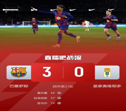 巴萨3-0皇家奥维耶多,本场比赛过后积52分重新登顶,领先皇马1分。