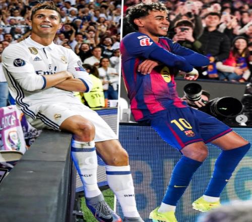 随后亚马尔坐在了场边的广告牌上,双手抱在胸前来庆祝这个进球。这样的庆祝动作与C罗效力皇马时期曾做出的经典庆祝动作极为相似。