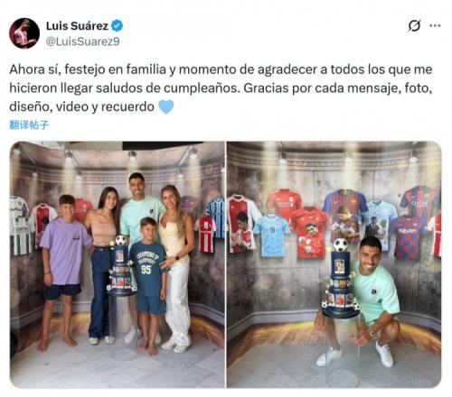 苏亚雷斯迎来39岁生日,他在社交媒体上晒出与家人一起庆祝生日的照片,并写道:“现在终于可以和家人一起庆祝生日了,也借此机会感谢所有给我送上生日祝福的人!感谢你们的每一条信息、每一张照片、每一个设计、每一段视频和每一份美好回忆!”