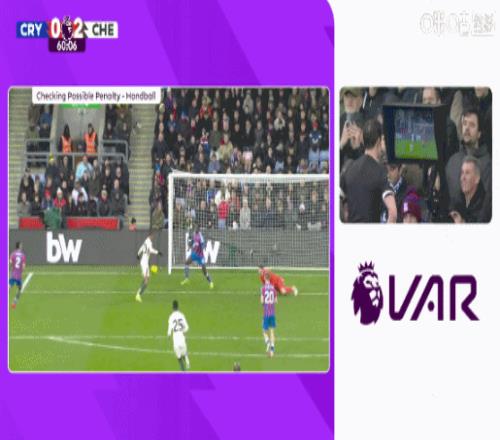 比赛第59分钟,若昂·佩德罗禁区内射门被水晶宫后卫坎沃挡出,随后VAR介入,主裁判观看视频回放后认为坎沃手球犯规,判给切尔西一个点球,并向坎沃出示了黄牌。