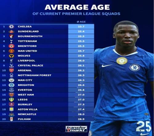 北京时间1月26日,德转统计出了本赛季英超20支球队的平局年龄,切尔西的现有阵容平均年龄仅为23.7岁,为英超最年轻球队,富勒姆28.9岁为平均年龄最年长的球队。