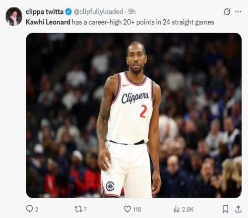 快船18战15胜!小卡场均32.1分联盟封王连续24场20+创生涯新高