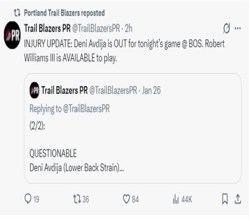 赛前开拓者更新伤病名单,阿夫迪亚确定缺席,罗威则可以登场。