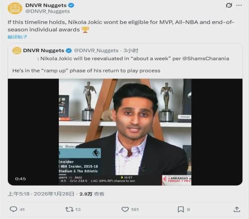 北京时间1月28日,掘金主场迎战东部第一活塞,约基奇继续休战。这是约基奇本赛季缺席的第15场比赛,如果再缺席3场,他将失去评奖资格。NBA名记Shams今天在节目中说道:“约基奇恢复顺利,掘金将在一周后评估他的伤情。”