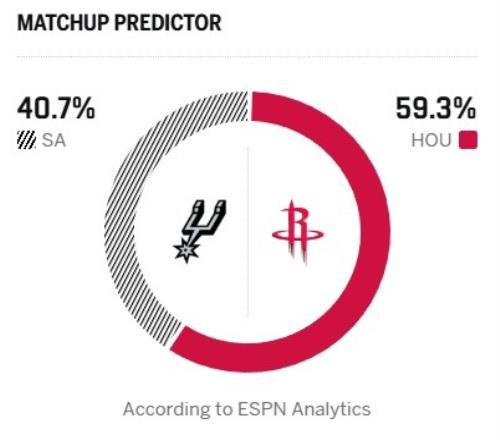 今日ESPN晒出了本场胜率预测,马刺为40.7%,火箭为59.3%。