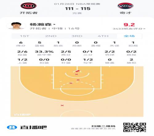 开拓者首轮16号秀杨瀚森 登场11.9分钟