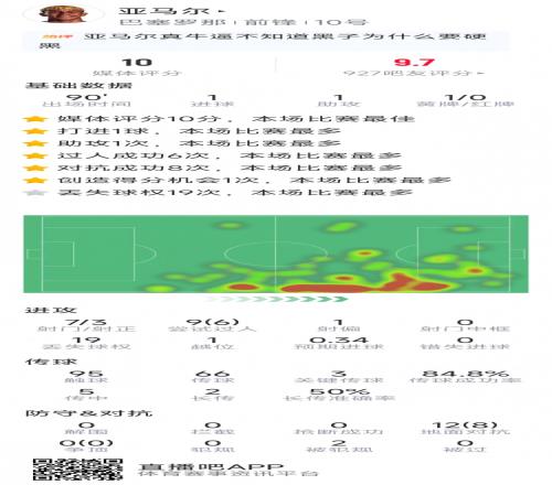 亚马尔本场数据:传射建功,3次关键传球,获评满分10分