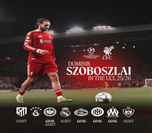 利物浦官方社媒晒出索博斯洛伊本赛季欧冠的数据,8场欧冠比赛,其中7场他参与进球,总计打进4球助攻4次。