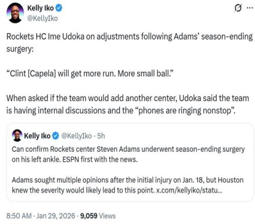 消息最先由ESPN名记Shams曝出,亚当斯左脚踝接受手术,确定赛季报销。随后火箭队官方确认消息真实性。