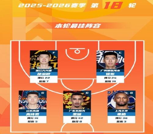 正因为有这样精彩的表现以及对于比赛胜负的巨大影响力,徐昕在1月24日入选了本赛季CBA第18轮常规赛的最佳五人阵容。