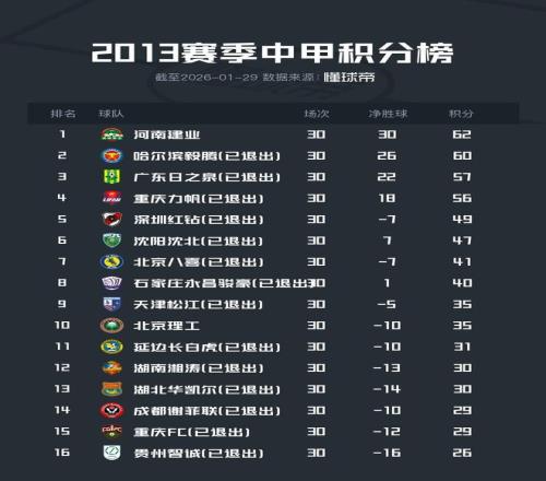 2013年参加中甲的所有球队里,现存球队仅剩河南建业(河南)和北京理工,其中河南今年被扣6分并罚款60万元,北京理工未受到处罚。