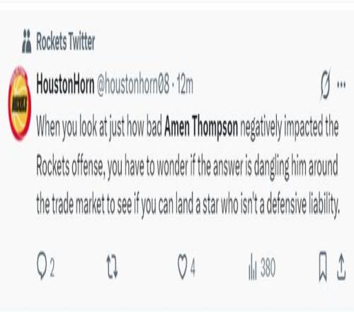 休媒:当你仔细想想阿门对火箭队进攻造成的负面影响之严重时,你不禁会想,是不是应该把他放到交易市场上抛售一番,看看能否淘到一位既不防守糟糕又具备明星实力的球员呢?