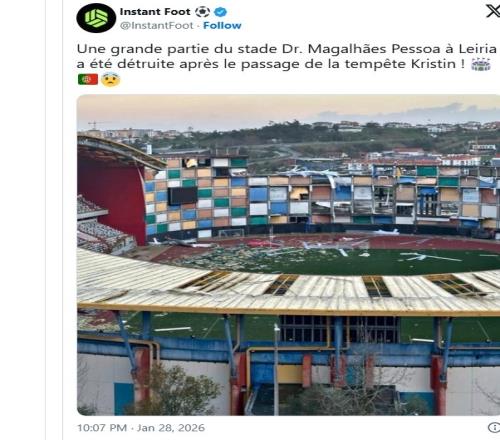 这座位于葡萄牙莱里亚的球场在恶劣天气袭击后遭受严重损坏,该体育场位于里斯本以北80英里处,曾承办2004年欧洲杯的两场比赛。