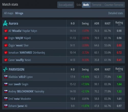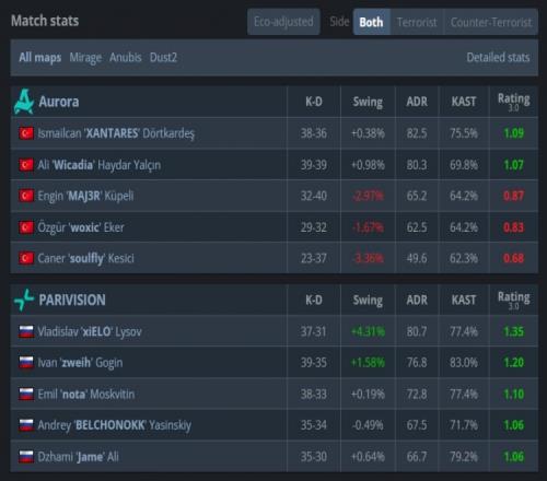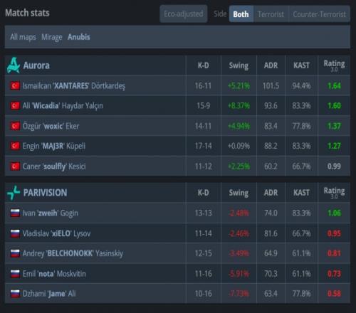易边再战,手枪局Aurora三二夹A得手,次回合Aurora静音四人带包上A小拿到第4分。来到长枪回合,zweih守A大前点被狠人击杀,随后nota与xiELO两人看B四杀,次回合上帝狗洞打掉woxic后回A平台再杀狠人为PV拿到赛点,最终Aurora四人上A小被PV缴杀,PV13-4拿下图三,大比分2-1战胜Aurora,晋级Stage2!
