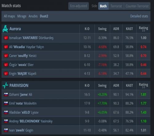 易边再战,PV拿下手枪局,次回合Aurora无甲手枪翻盘拿到第10分,PV四人再赌B点枪械不全被Aurora下包拿分,第16回合woxic水下与黑屋各拿击杀,zweih捡到AK三杀到手拿到第5分。但woxic大狙再次发力双杀为Aurora拿到赛点,最终Aurora道具一波冲B得手,以13-5拿下图二。