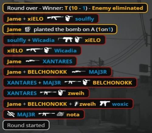 再到长枪回合,Aurora双狙防守,nota开场火烧中路woxic得手,Jame一把AK进B双杀但被nota手雷炸飞,狠人与soulfly联手三杀帮助Aurora拿到第5分。PV起五把Tec-9再打B点送出第6分。第10回合woxic强拆C4得手拿到第7分。PV继续控A夹B,Jame残局1v2连续两次假下包未能引出对手对枪耗尽时间送出第8分。最终狠人双杀收尾,Aurora以9-3结束上半场。
