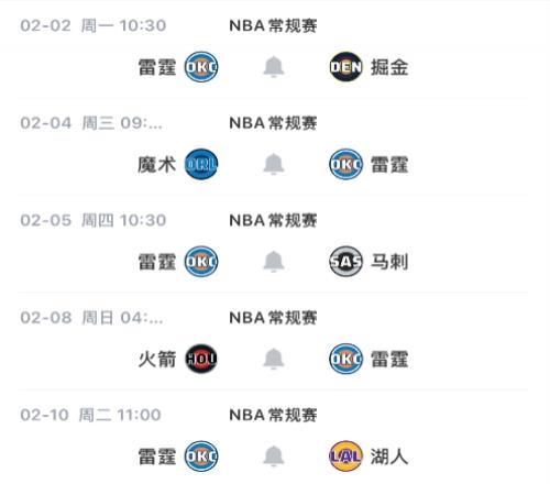 全是硬茬!雷霆未来五场赛程:掘金魔术马刺火箭湖人